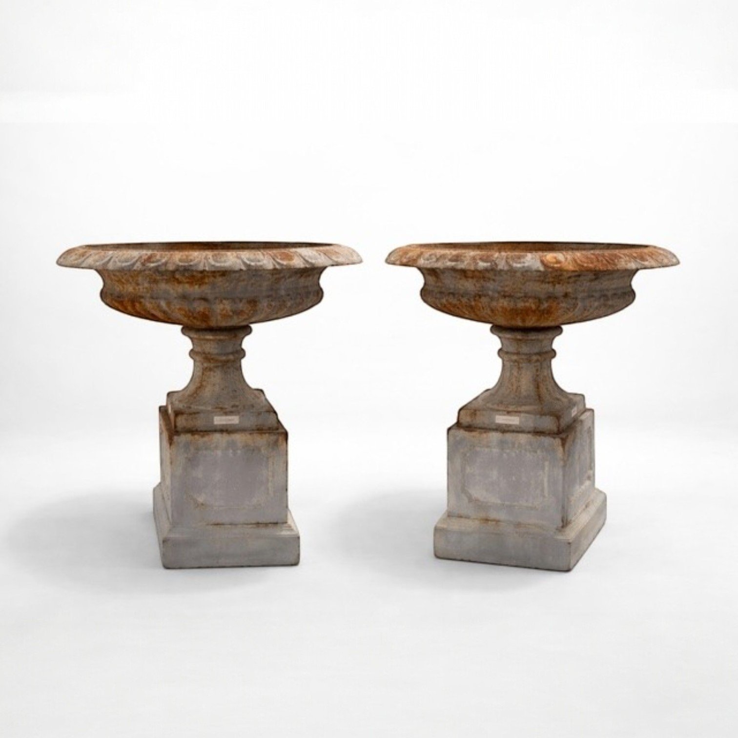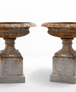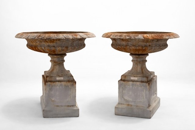 Decorated with classical relief details and an elegant egg-and-dart rim. Generous planting space, perfect for florals or topiary. A rare and sculptural pair, ready for immediate use.