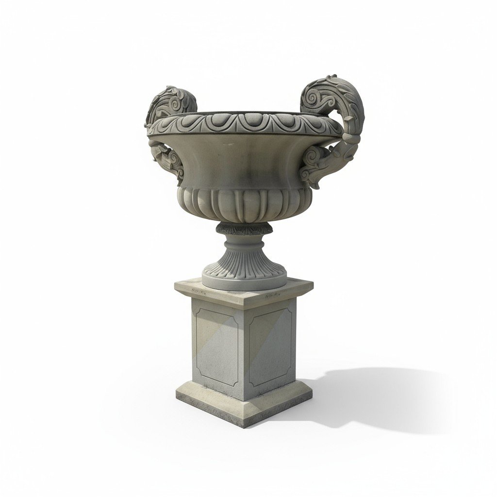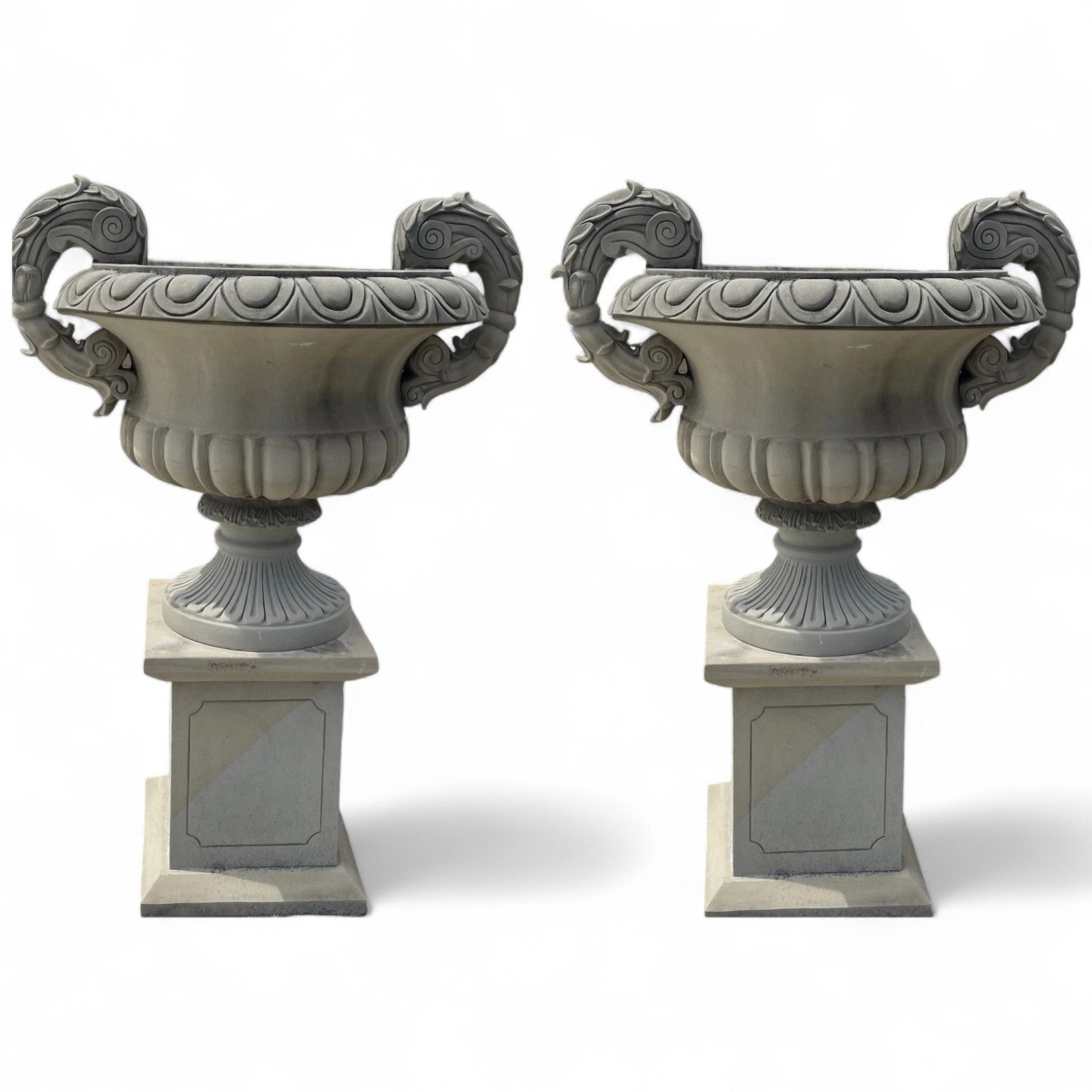 An elegant pair of hand-carved limestone urns from Italy, each resting on a squared pedestal base. The classical design features bold scrolled handles, a wide fluted body, and a richly detailed rim with stylized leaf motifs. Crafted from natural limestone, these urns display a timeless patina that enhances their sculptural presence.