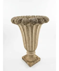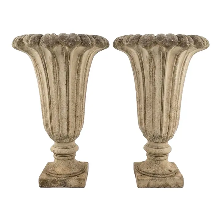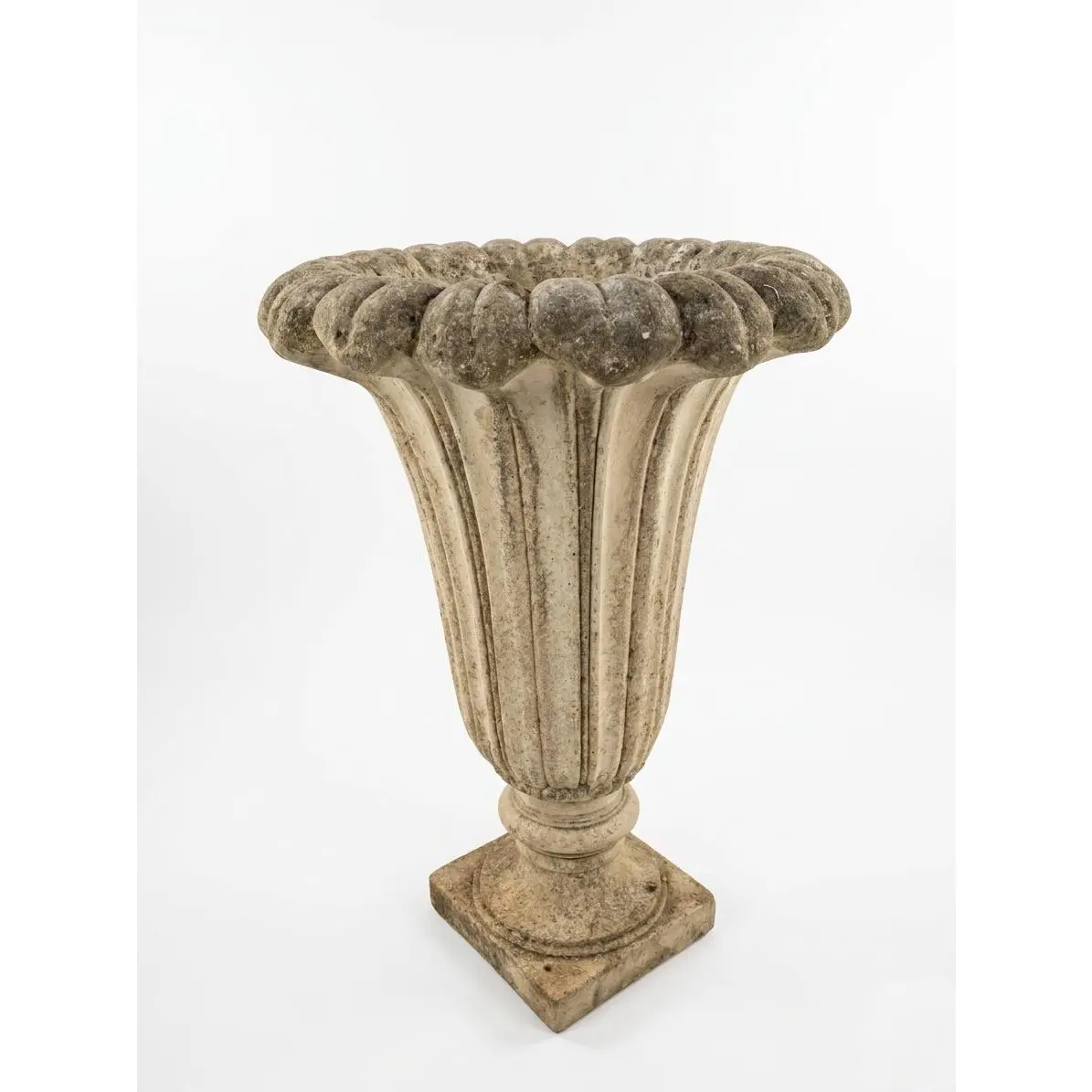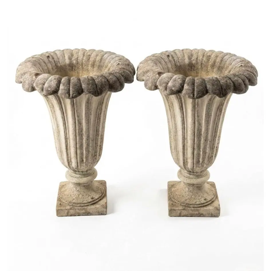 This striking pair of vintage cast stone urns, crafted in England, offers a refined architectural silhouette perfect for bringing a sense of history and structure to any space. Designed in the classic Campana style, these planters feature deep fluted bodies and a distinctive scalloped, gadrooned rim that creates a graceful, flowering profile.