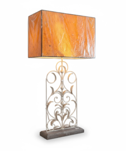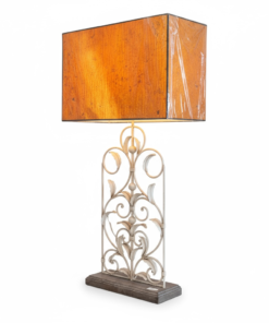 Elevate your space with this elegant pair of handcrafted table lamps, combining ornate wrought iron scrollwork with a solid wooden base for timeless appeal. Each lamp is topped with a rich, rectangular leather lampshade in a warm amber tone, adding depth and sophistication to the glow.