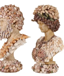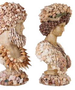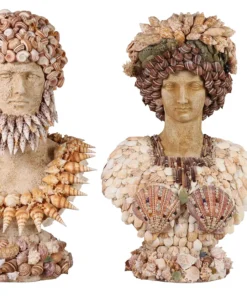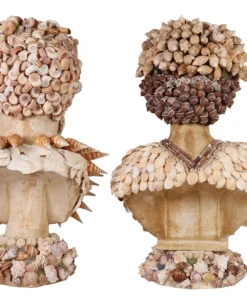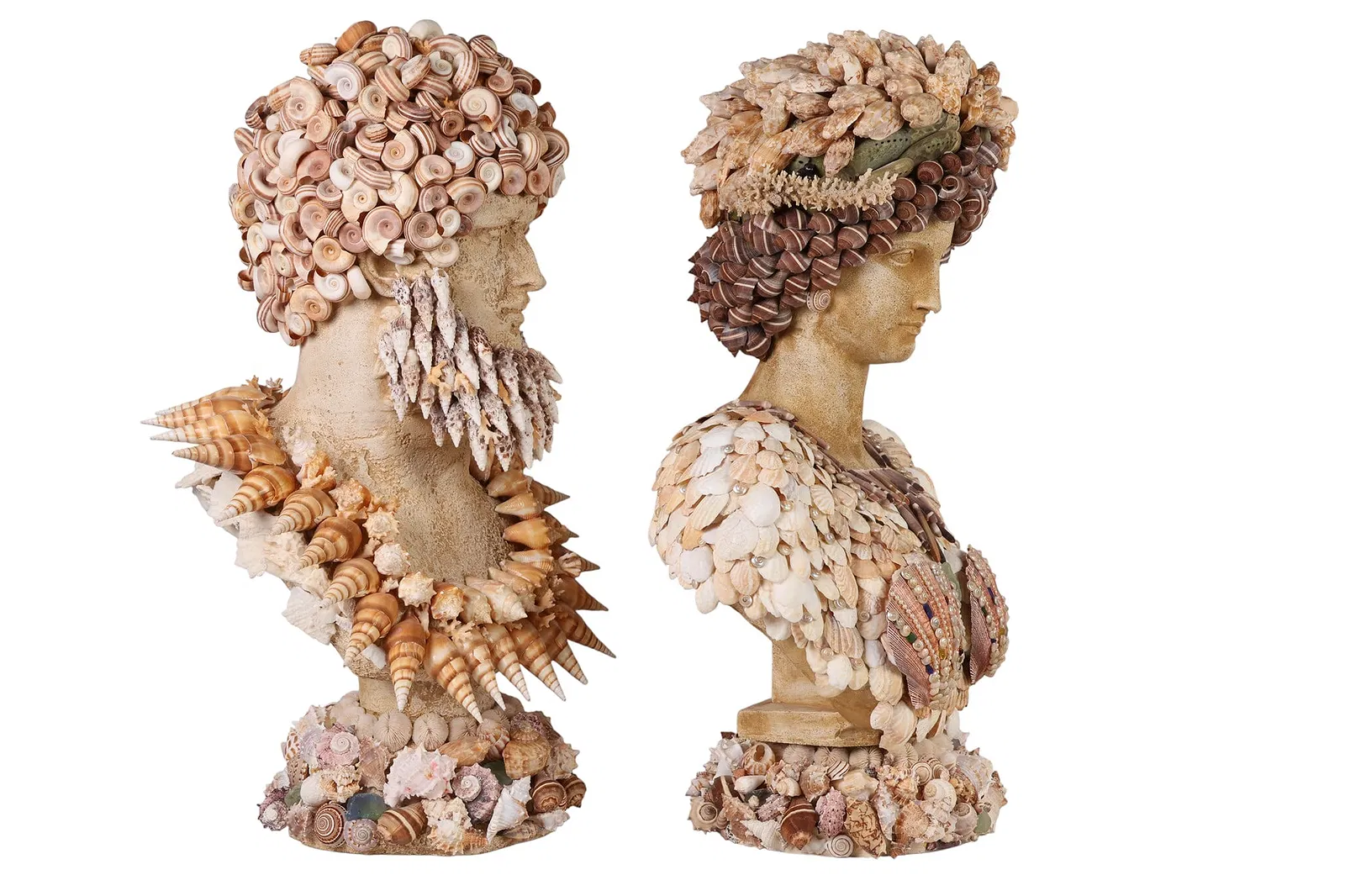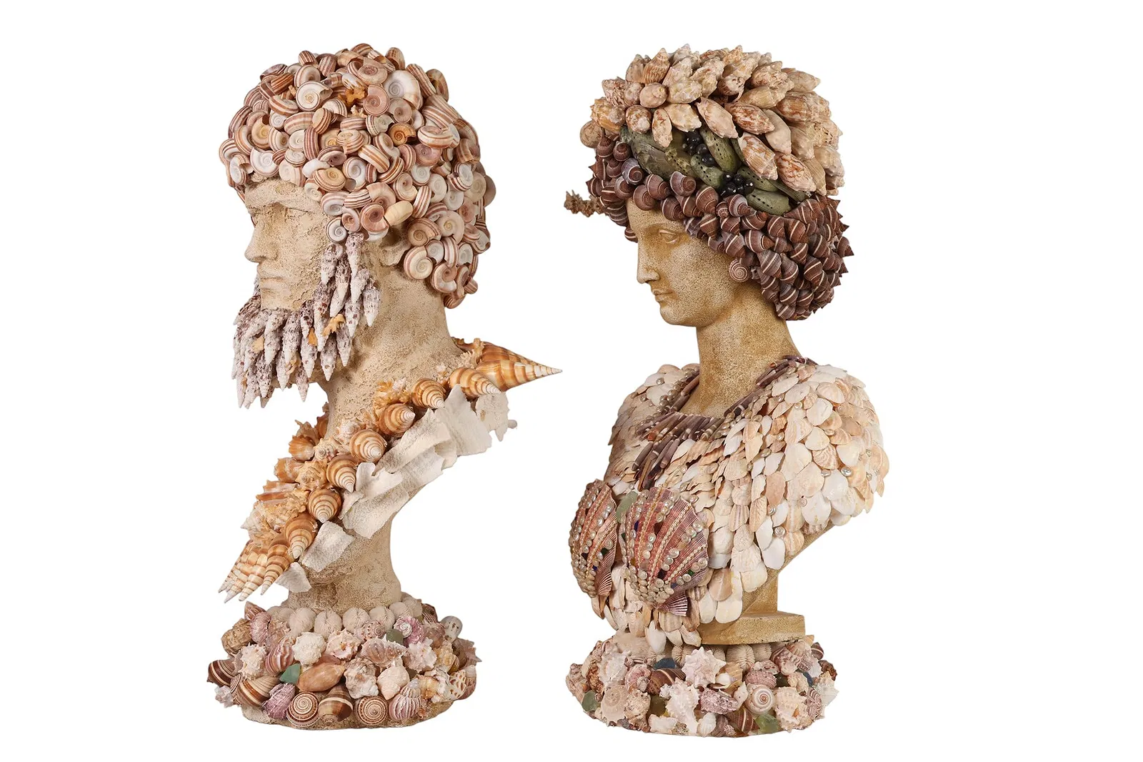 A pair of decorative bust sculptures embodies the distinctive elegance of Palm Beach Regency style, each richly embellished with an array of natural seashells in a sophisticated coastal motif. The female figure is adorned with elongated shell forms and an ornate neckpiece composed of bold, oversized specimens, creating a graceful and sculptural presence. The complementary male bust features a dramatic coiffure of spiraled shells and a textured facial arrangement suggesting a stylized beard and structured collar.