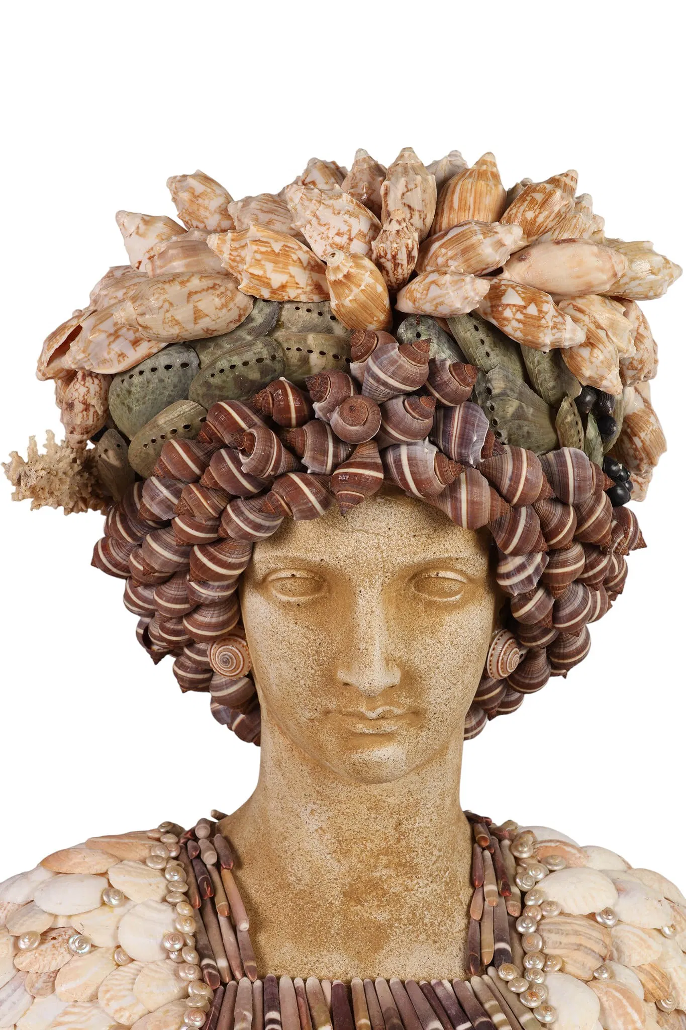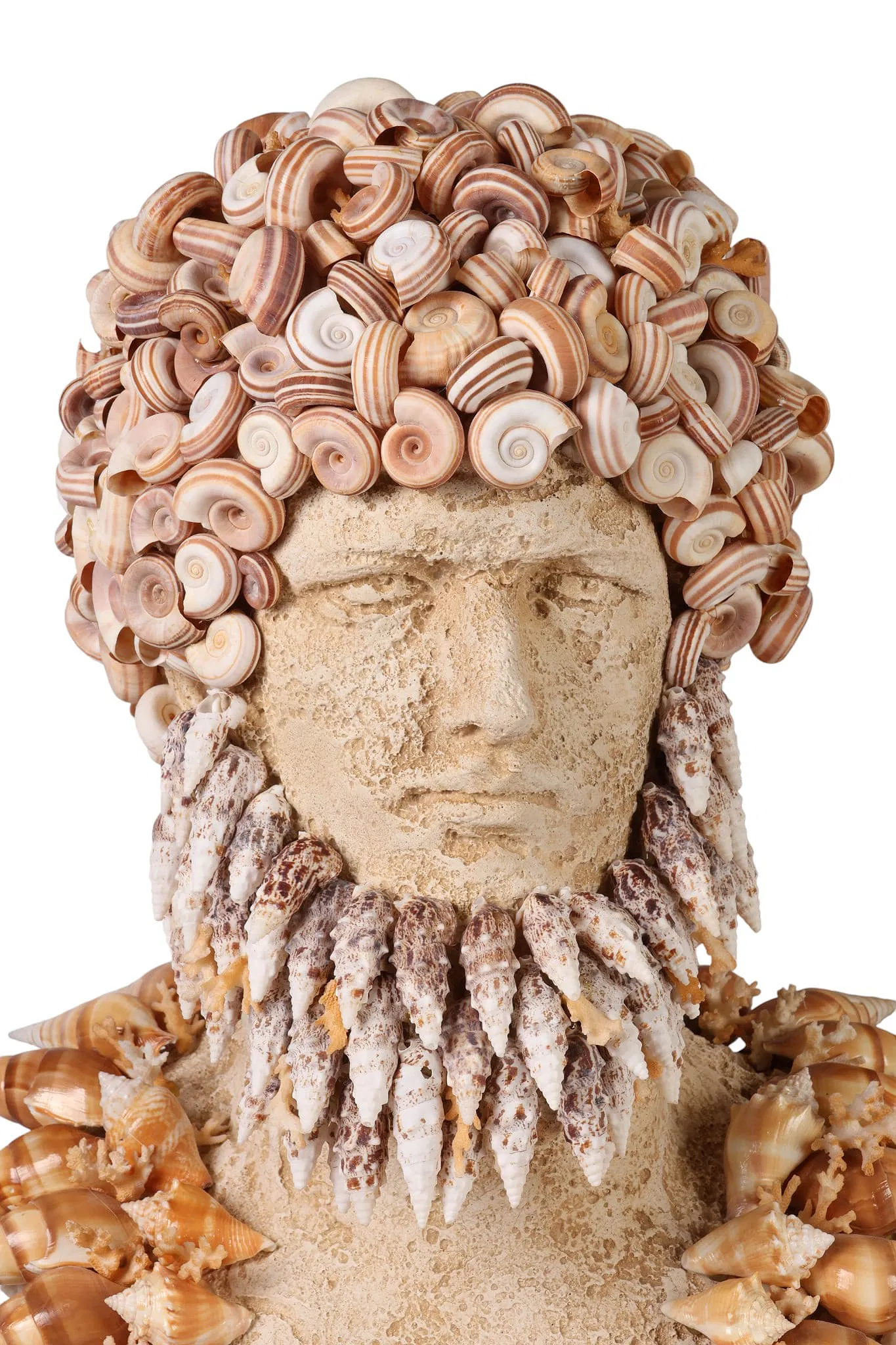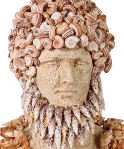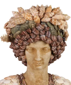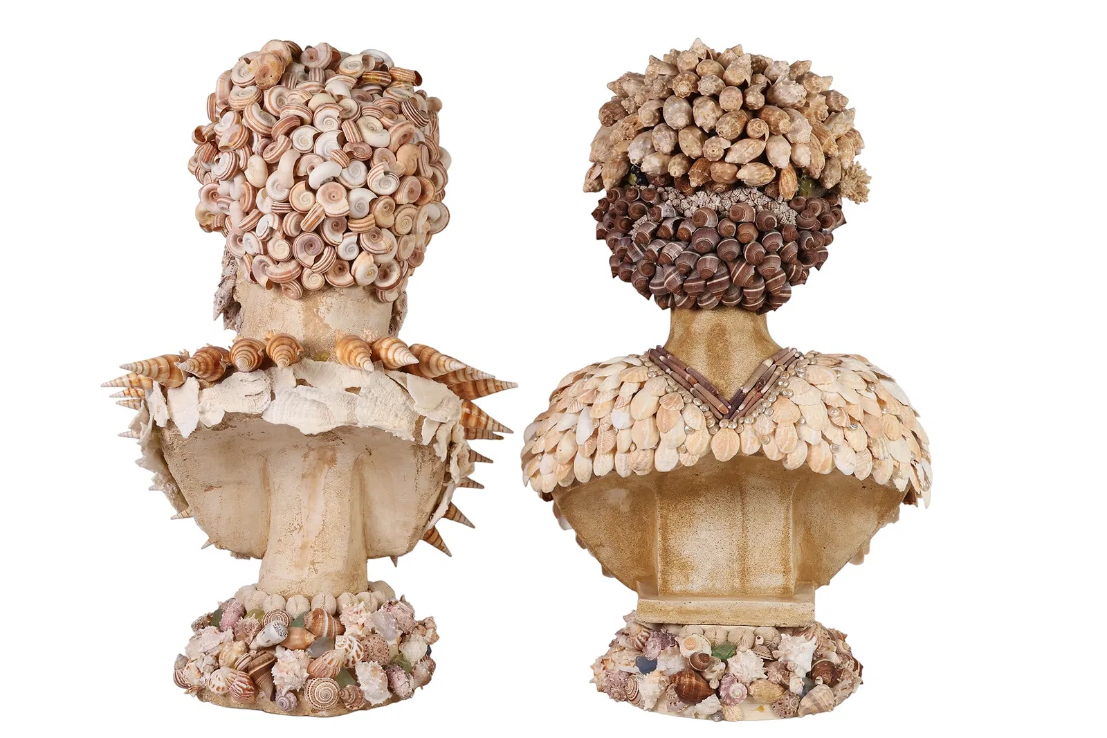 A pair of decorative bust sculptures embodies the distinctive elegance of Palm Beach Regency style, each richly embellished with an array of natural seashells in a sophisticated coastal motif. The female figure is adorned with elongated shell forms and an ornate neckpiece composed of bold, oversized specimens, creating a graceful and sculptural presence. The complementary male bust features a dramatic coiffure of spiraled shells and a textured facial arrangement suggesting a stylized beard and structured collar.