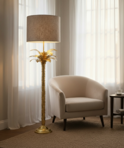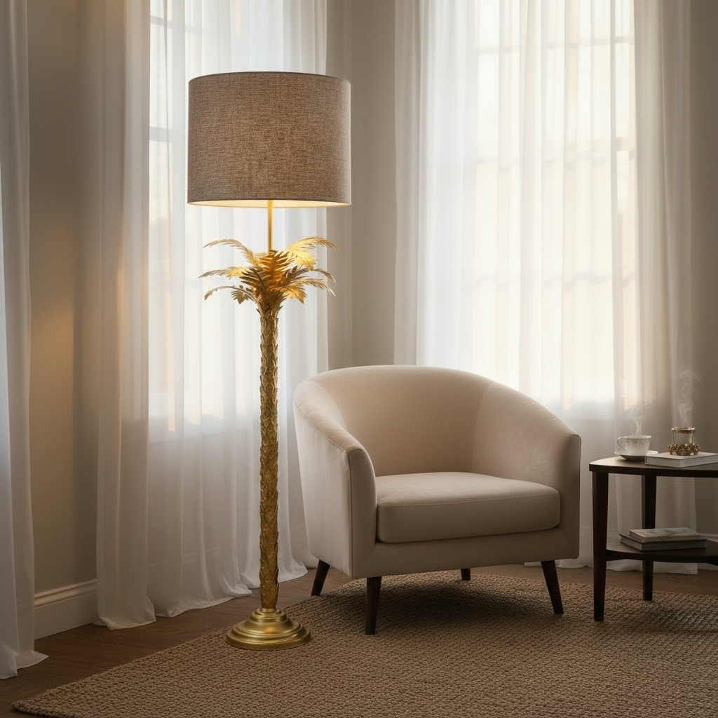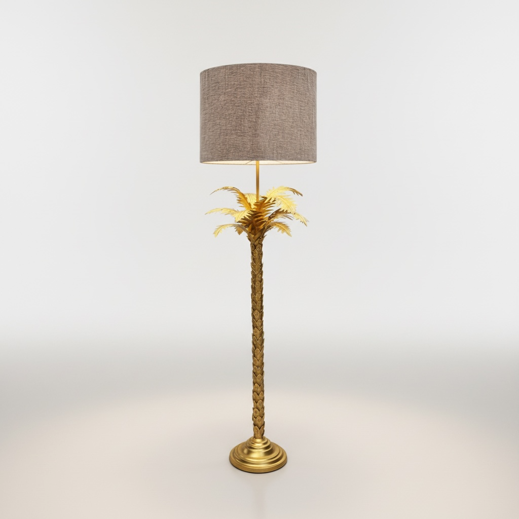 Elegant palm tree floor lamp with a sculptural trunk and detailed frond canopy in a warm gold finish. Topped with a neutral shade, it adds a refined tropical touch—perfect for coastal or Palm Beach–style interiors.