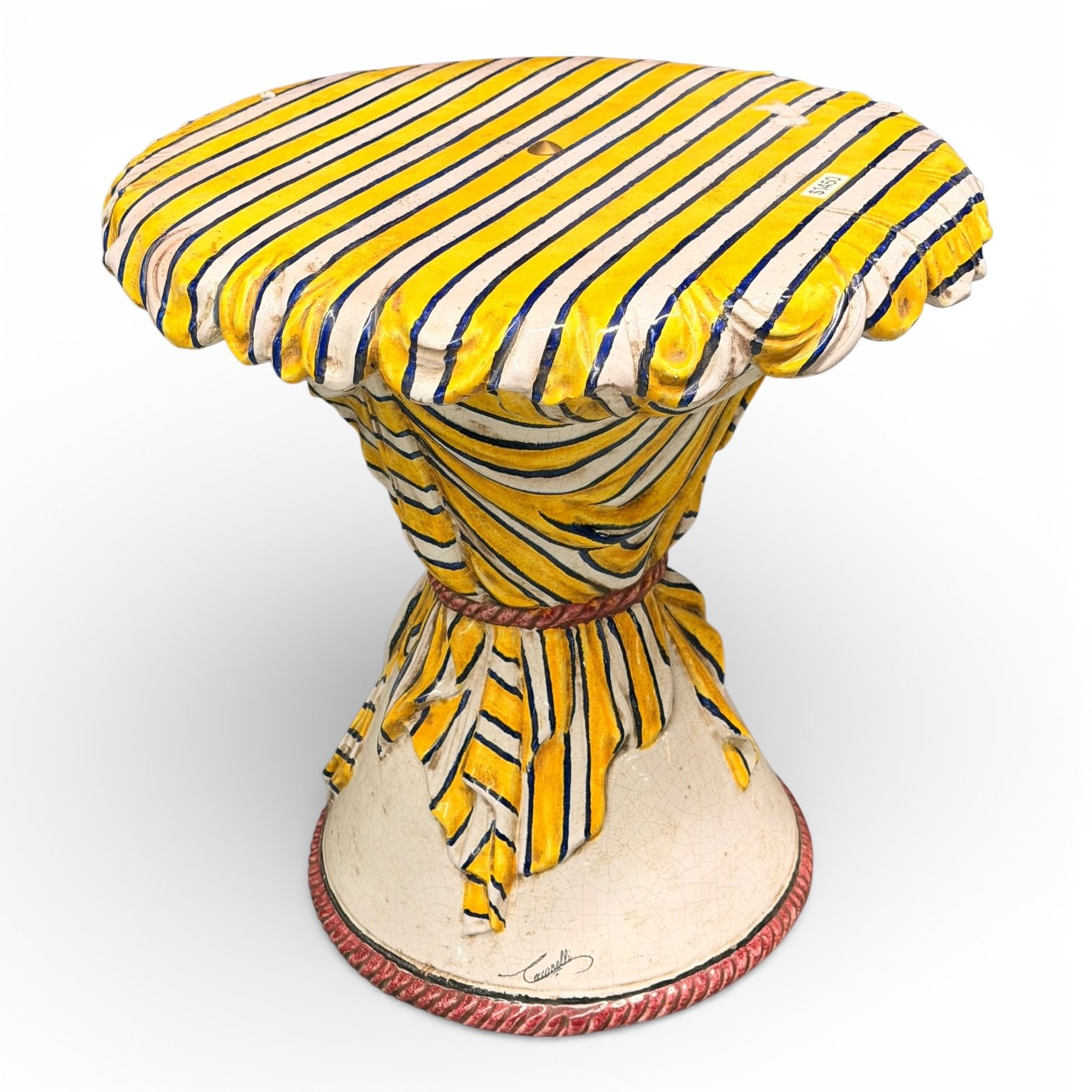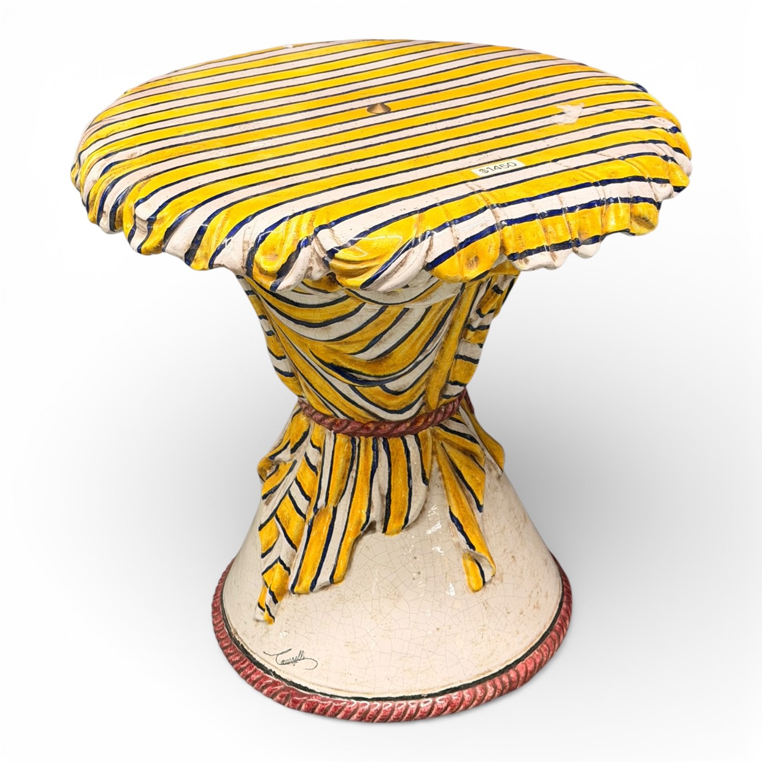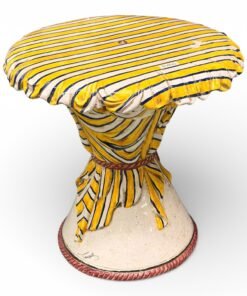 This striking Italian ceramic side table features bold hand-painted yellow and white striping accented with deep blue detailing, creating a lively yet refined Mediterranean aesthetic. The sculptural form is designed to resemble gathered fabric tied at the center, complete with trompe-l’oeil folds and rope-style accents that highlight the artisan craftsmanship.