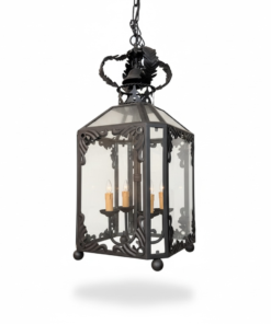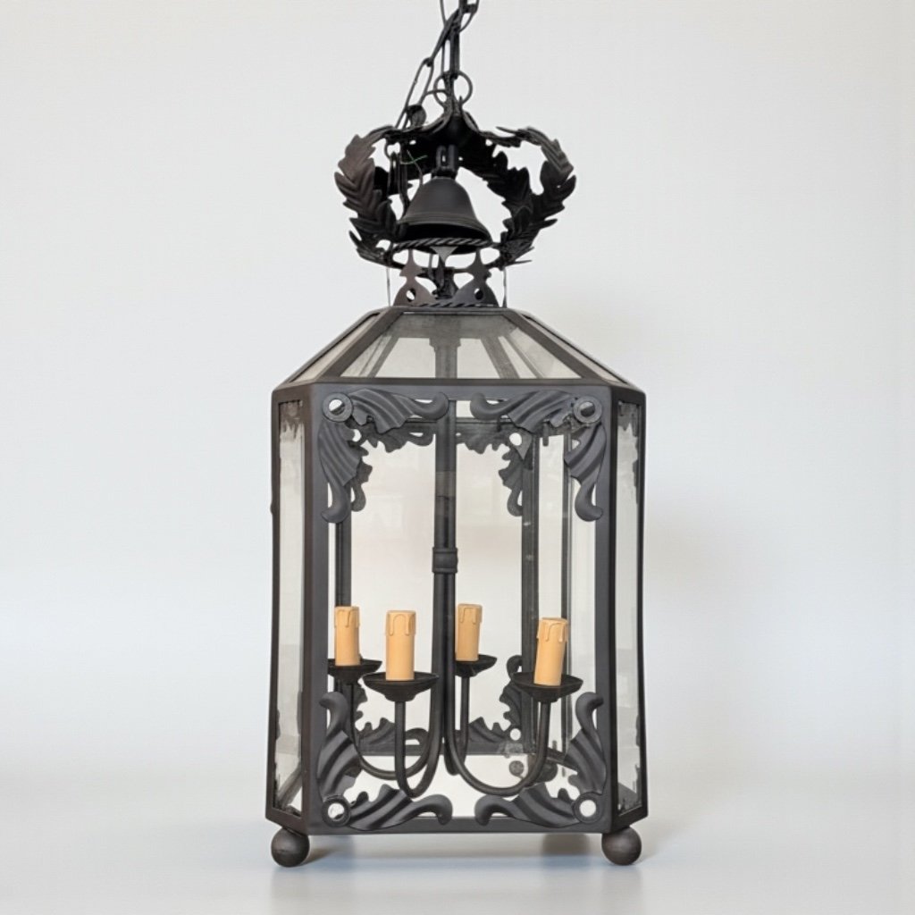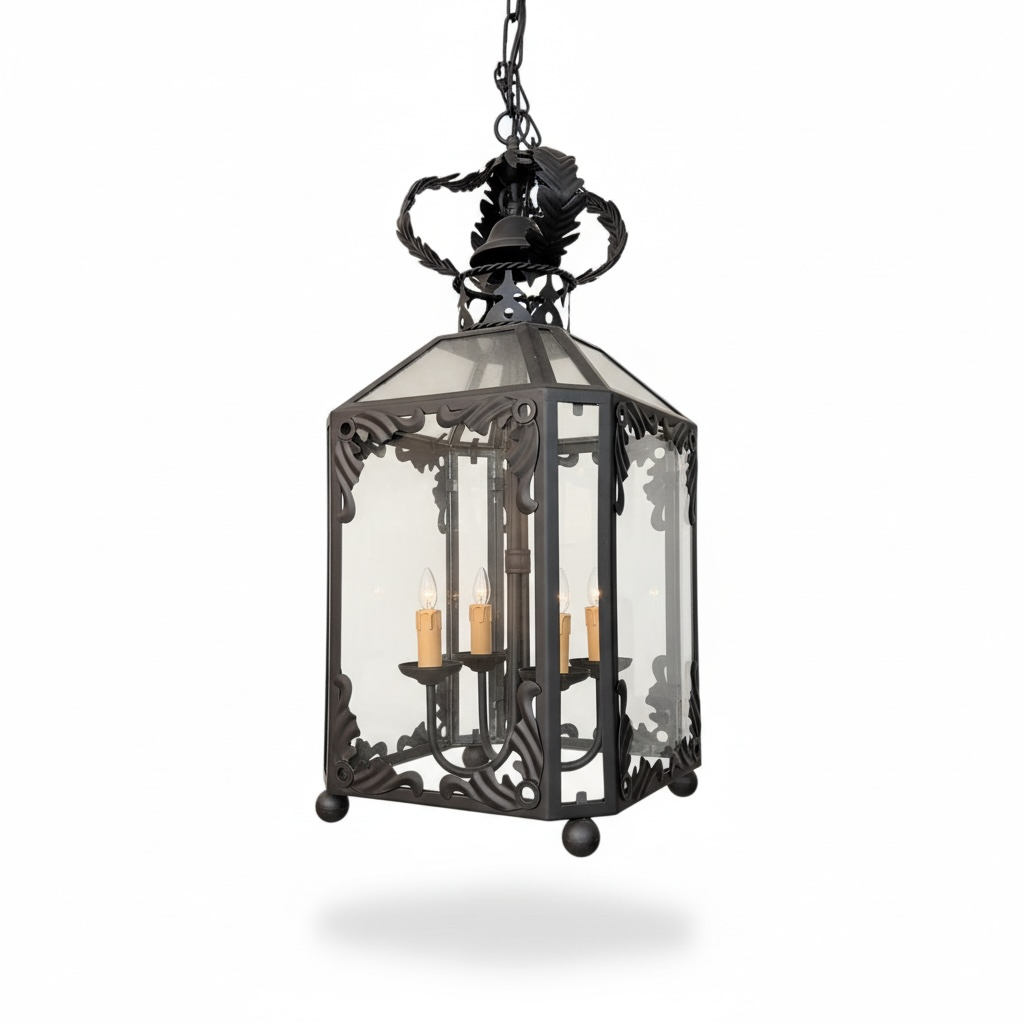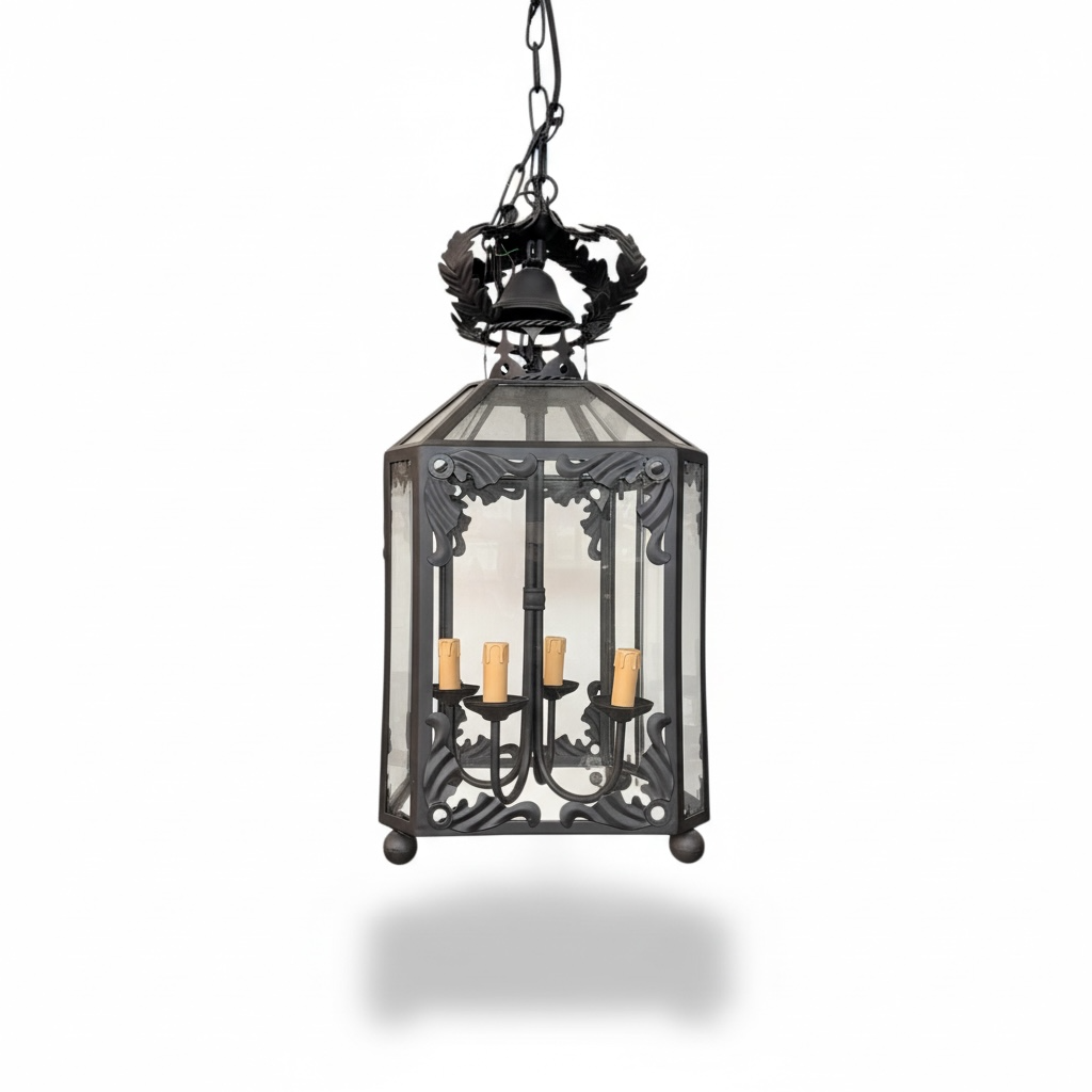 A classic lantern featuring an intricately detailed wrought-iron frame with elegant scrolling and leaf motifs. The multi-pane glass enclosure surrounds candle-style lights, creating a warm and timeless glow. Finished in a rich, dark patina and suspended from a decorative chain, this piece is ideal for entryways, covered patios, garden rooms, or refined interior spaces. A beautiful example of traditional craftsmanship and architectural detail.