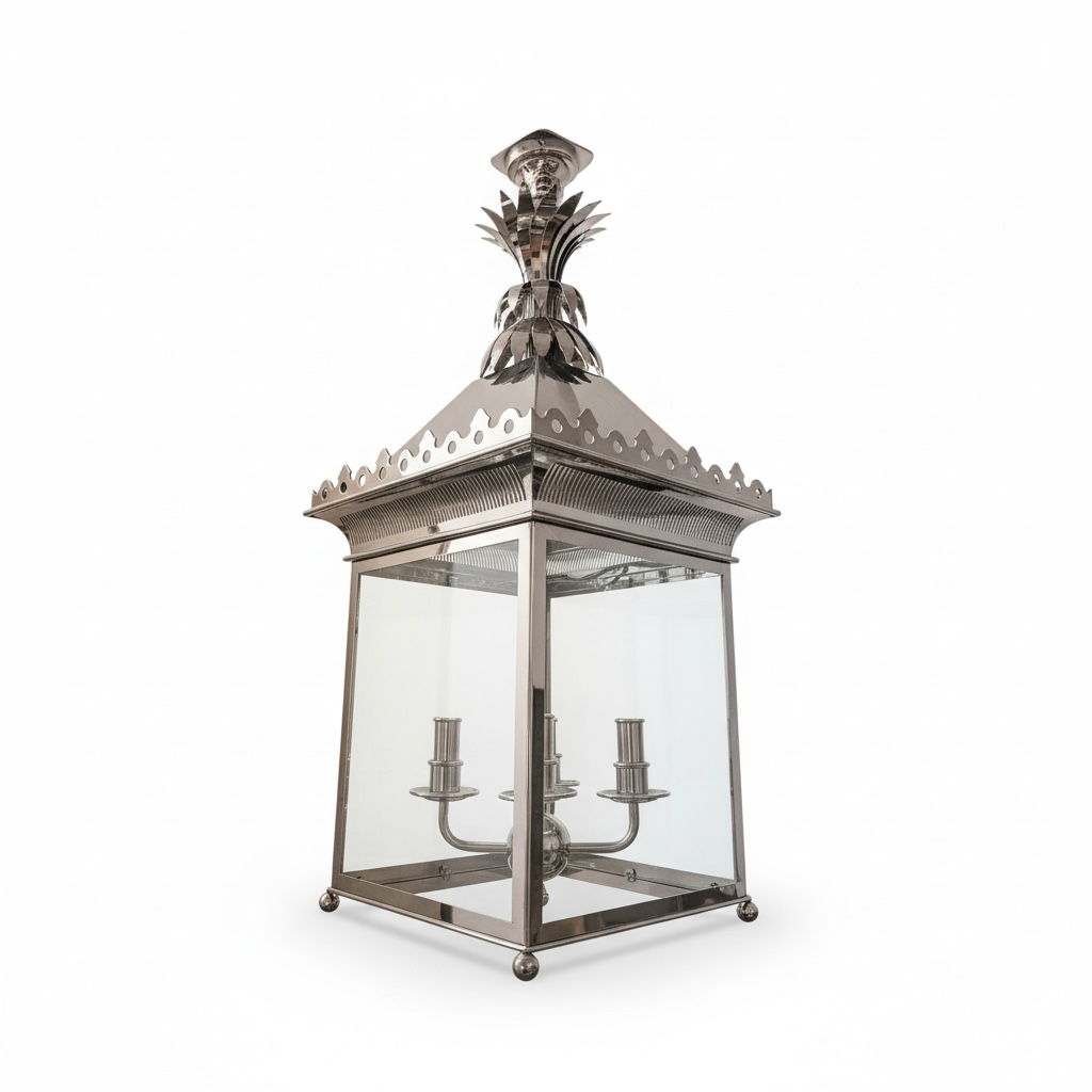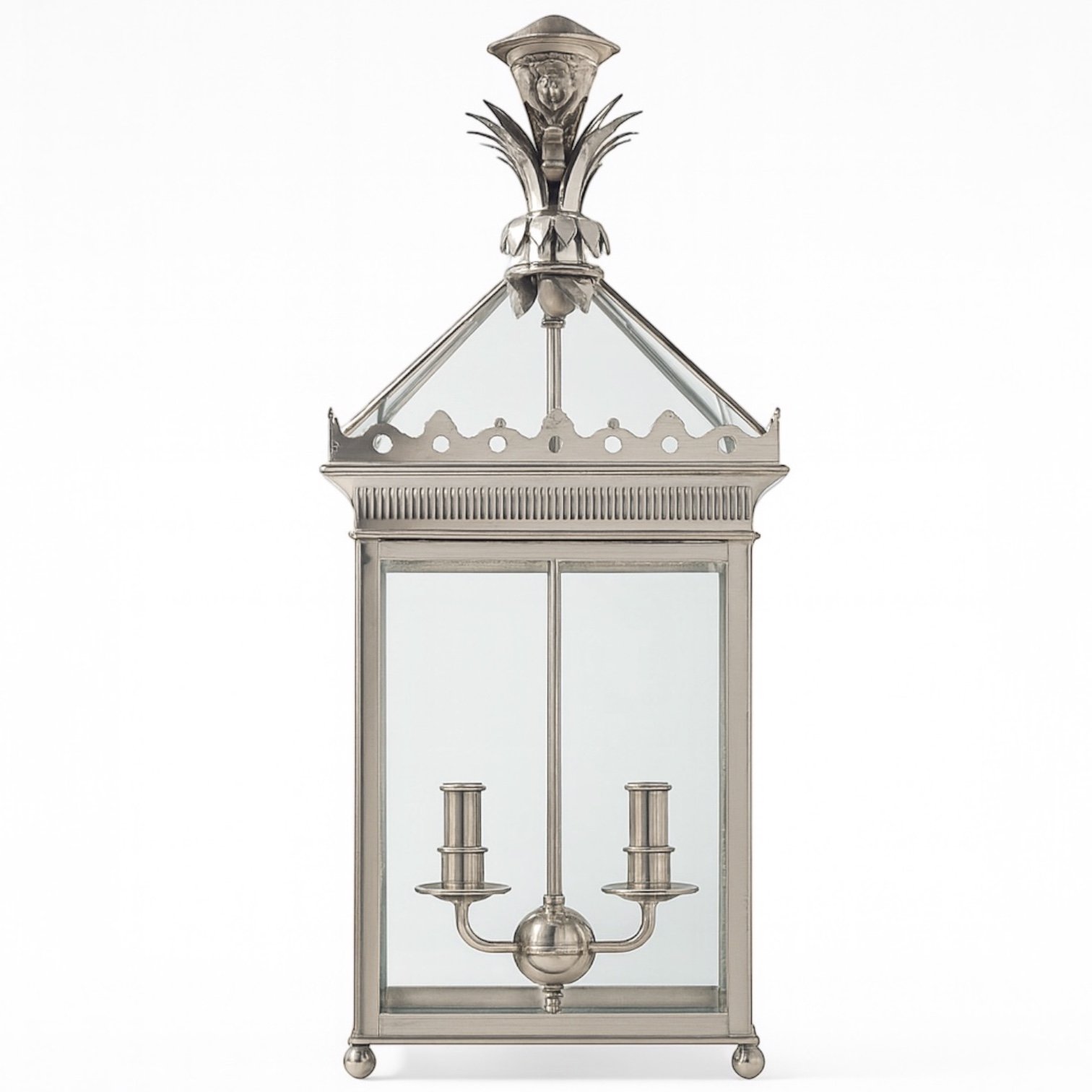An elegant lantern featuring a refined, neoclassical-inspired silhouette with clean lines and precise detailing. The silver-tone metal frame is accented by a pierced crown band and topped with a decorative finial inspired by classical and botanical forms. Clear glass panels reveal two candle-style light holders set on a sculptural central stem. Finished in a soft, antique silver patina, this piece is well suited for entryways, covered patios, stair halls, or sophisticated interior spaces where a timeless architectural presence is desired.