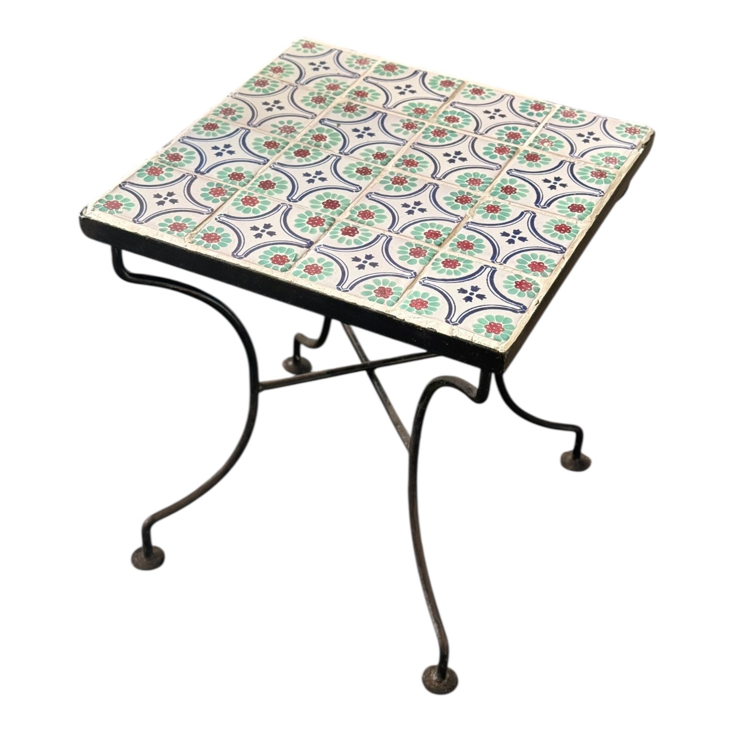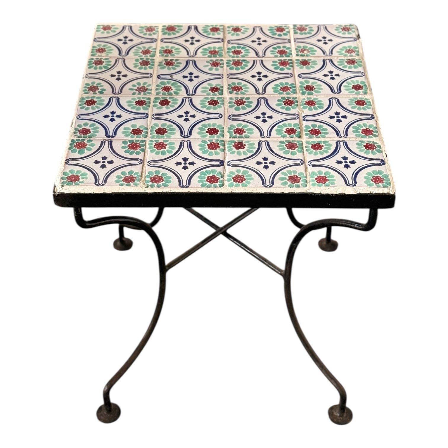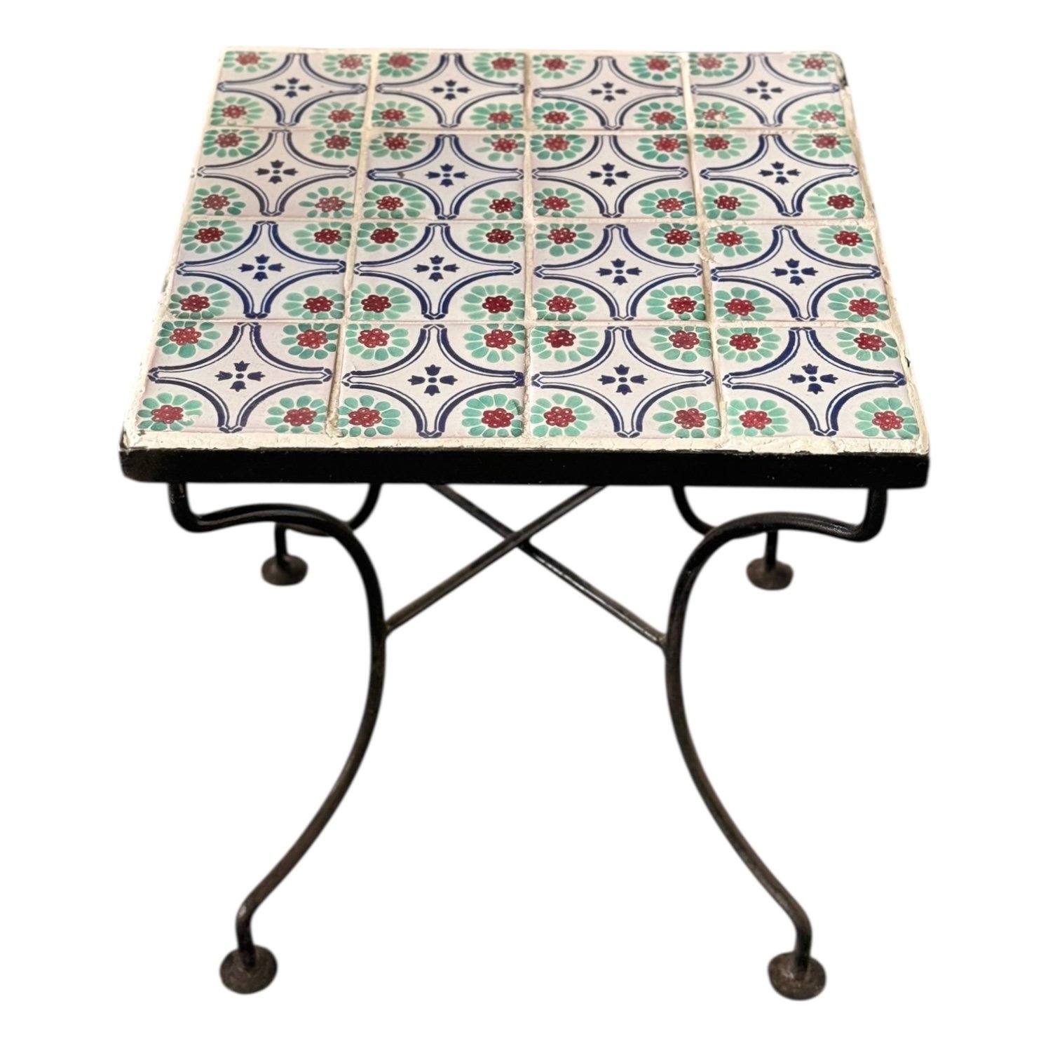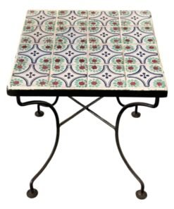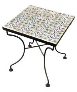 Square Tunisian side table with a wrought iron base and a colorful tiled top, featuring traditional geometric and floral motifs in red, green, and blue. A vibrant piece that brings Mediterranean charm indoors or outdoors.