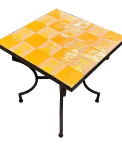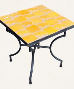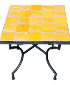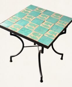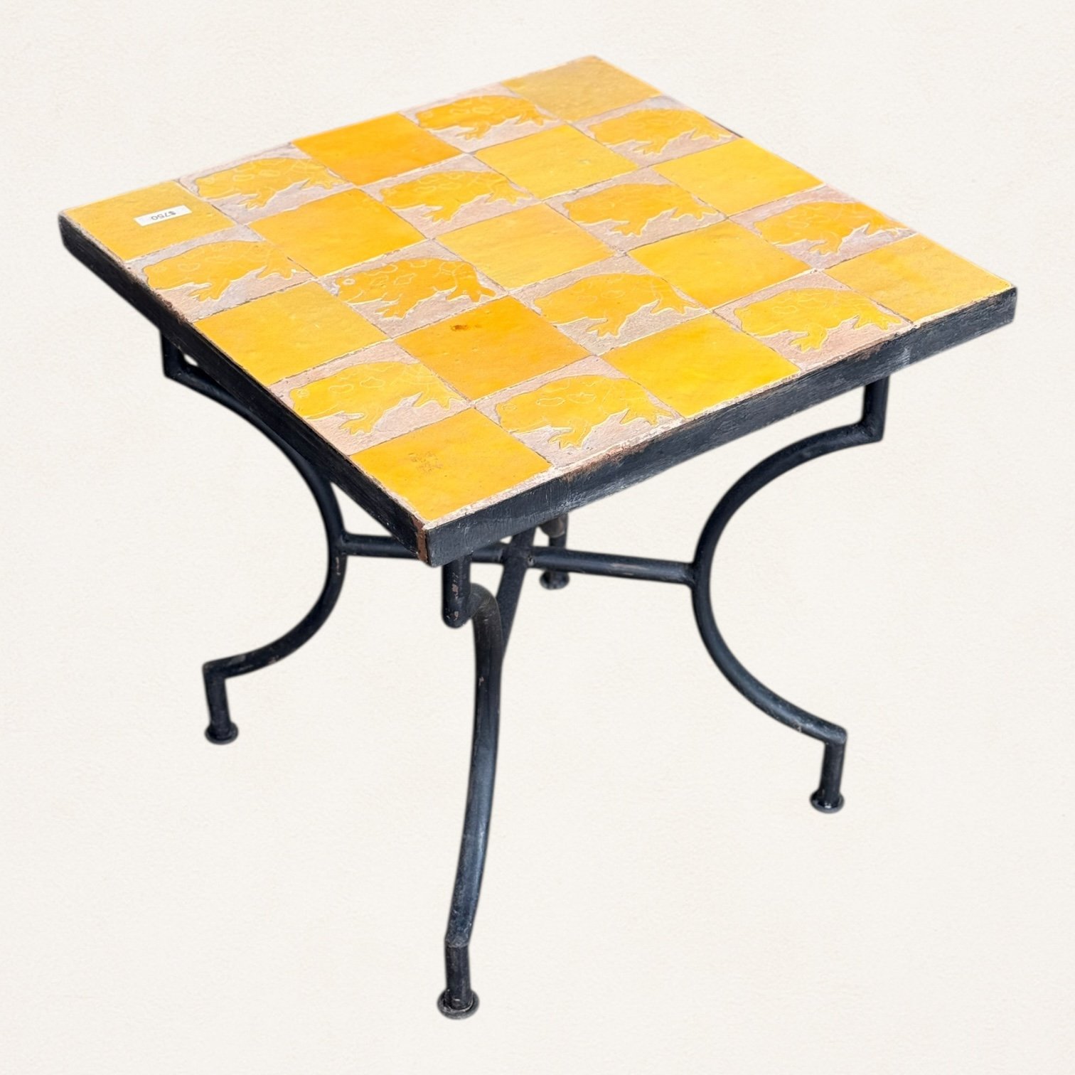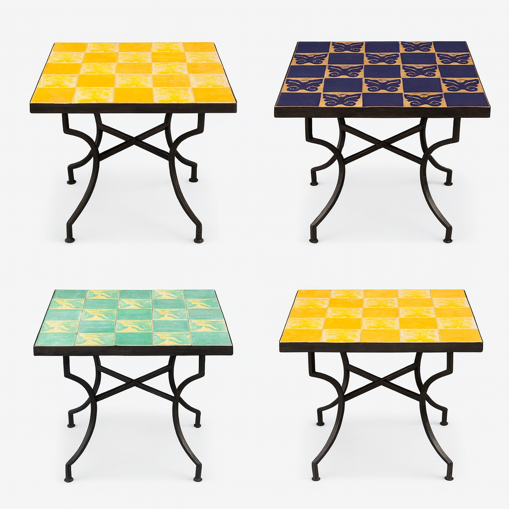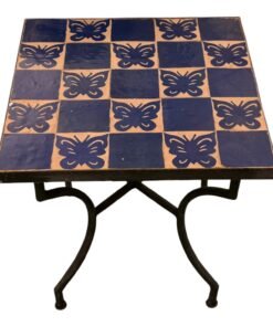 A wonderful square table featuring a hand-laid ceramic tile top in a bold cobalt blue with repeating decorative motifs. The tiles are set within a sturdy iron frame, supported by gracefully curved legs that add both strength and elegance. The rich contrast of the deep blue glaze against the warm terracotta tones creates a vibrant, timeless look.