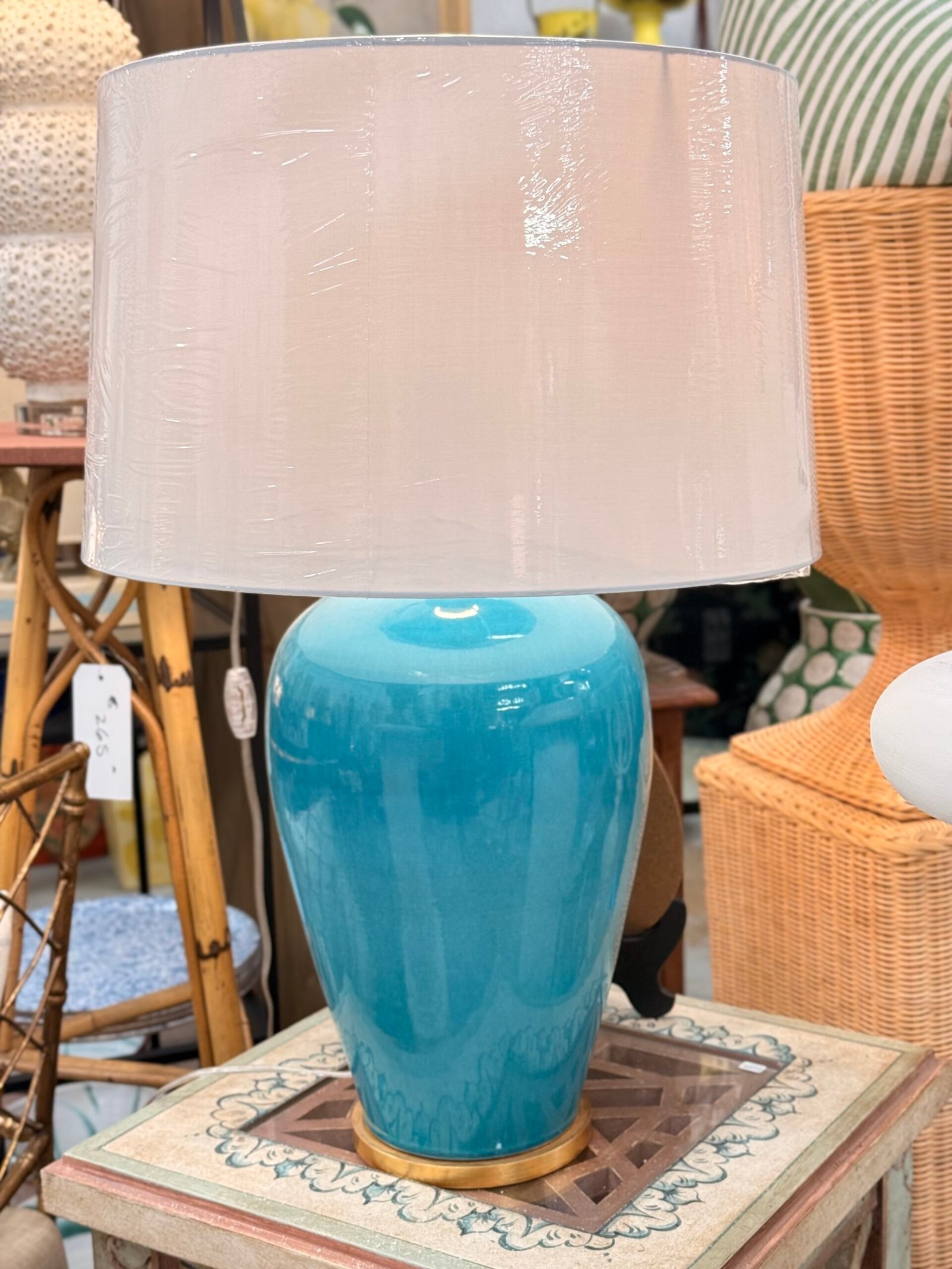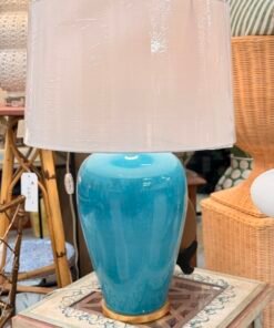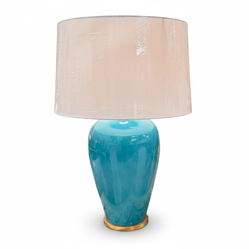 Elegant turquoise ceramic lamp with a smooth glossy finish and brass base. Wired for electricity and sold with shade included. A fresh, coastal touch for living rooms, bedrooms, or entry consoles.