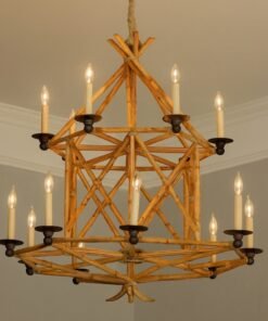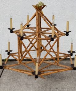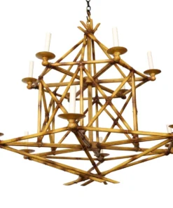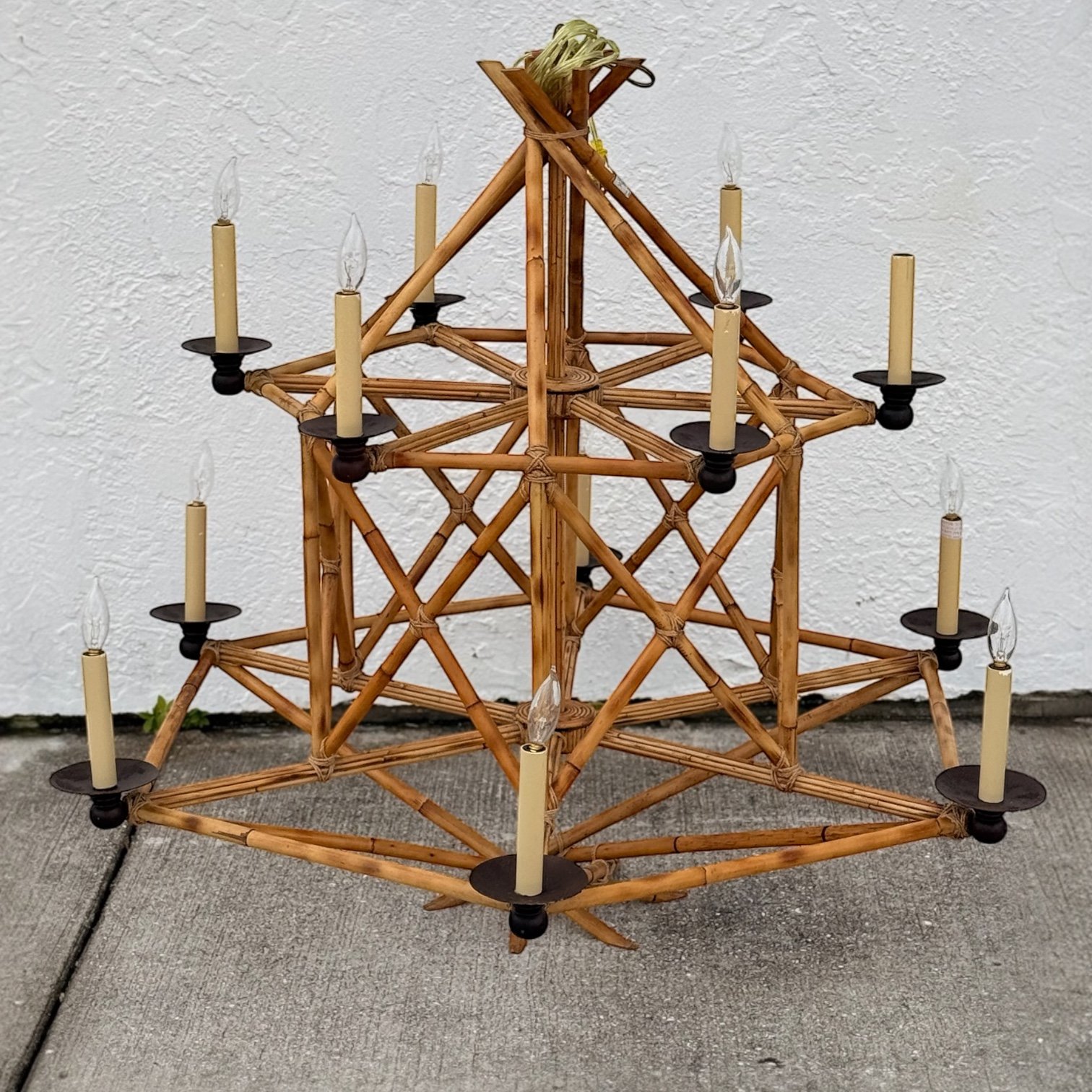 An elegant two-tier chandelier with twelve lights, crafted in a hand-painted faux bamboo design over a brass frame. The open cage structure is formed by intricately cross-banded bamboo-style sections, creating a striking architectural silhouette. Each arm features a shaped bobeche with candle sleeves, enhancing its refined, classic look. Recommended maximum wattage: 60 watts per socket. This custom design can be fabricated in alternate sizes and artisan finishes upon request.