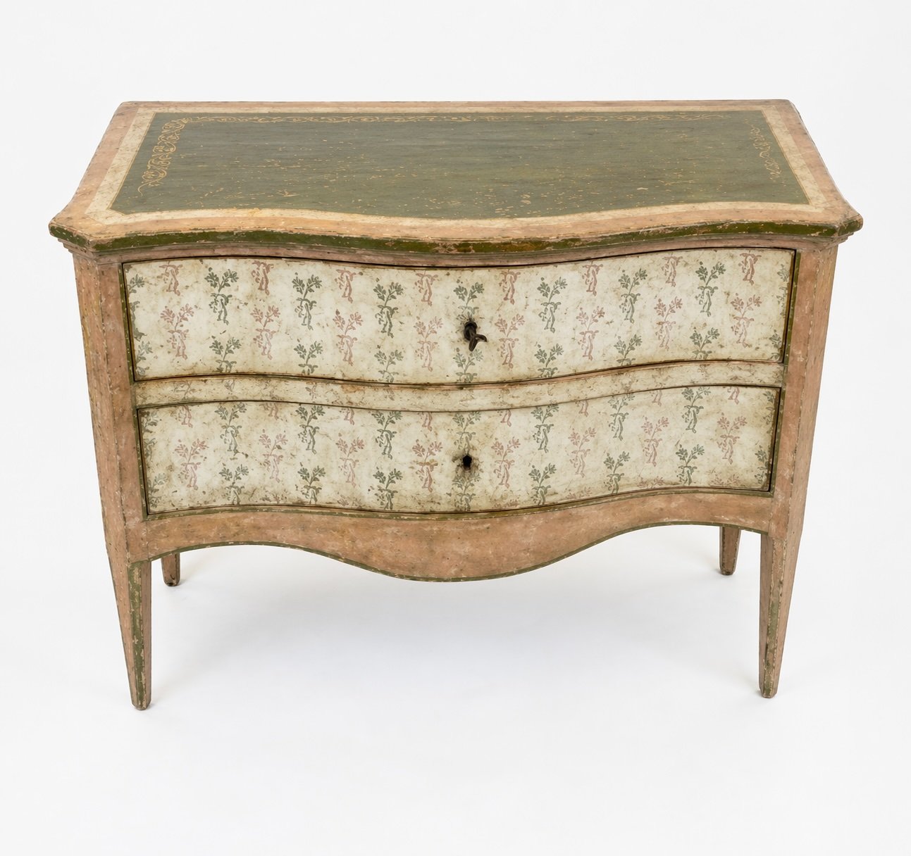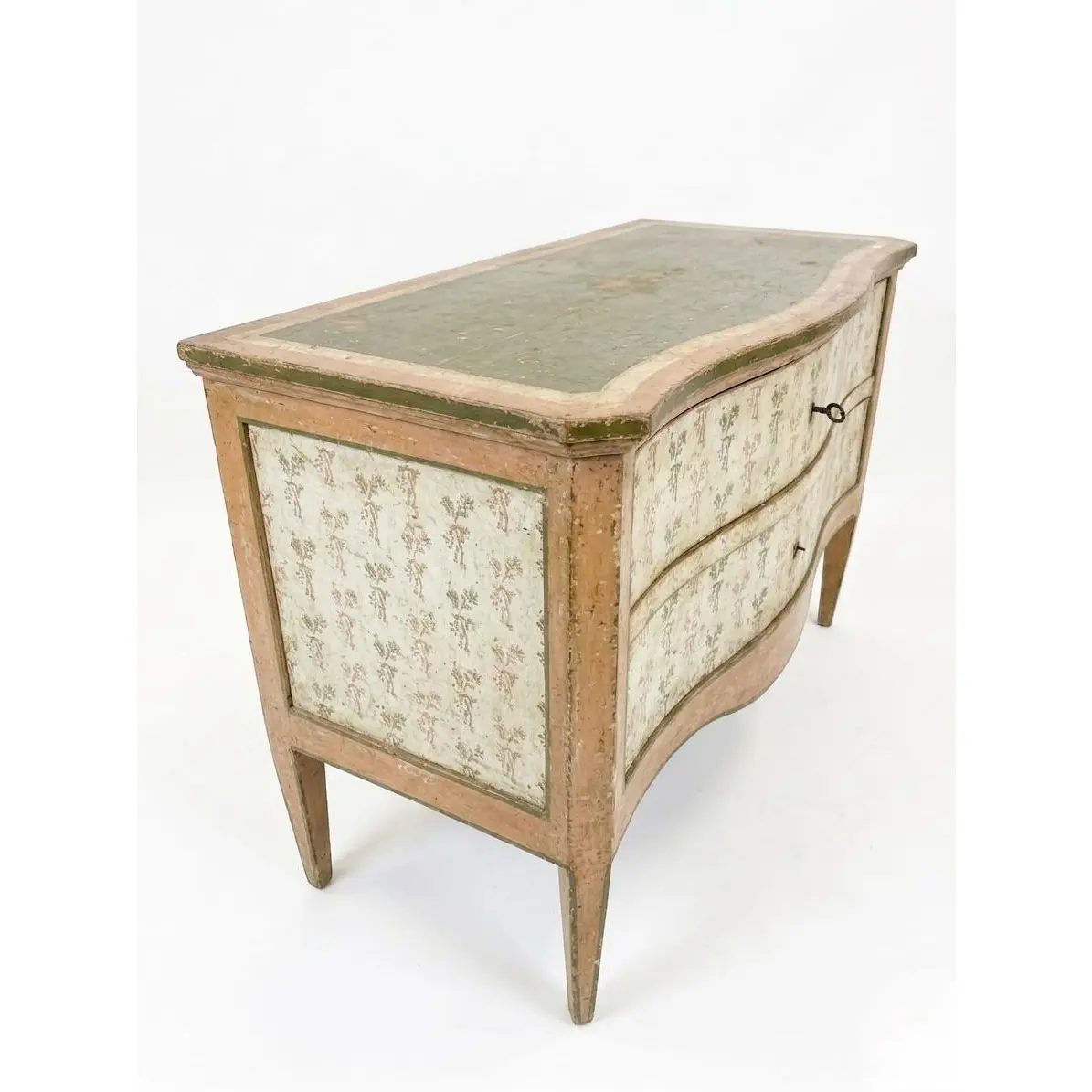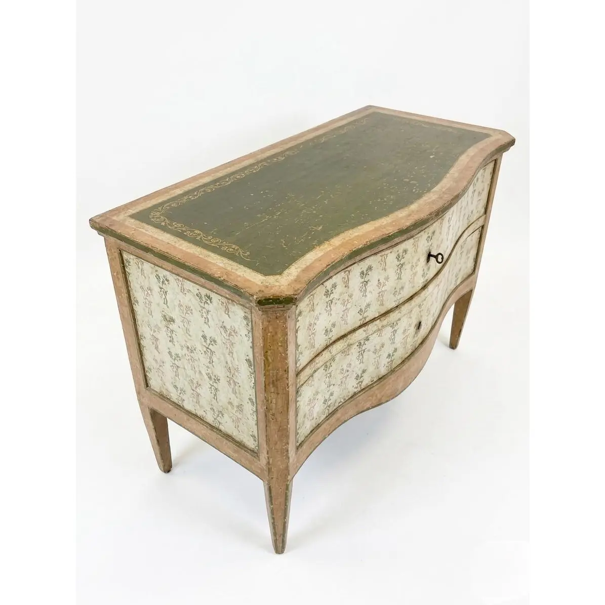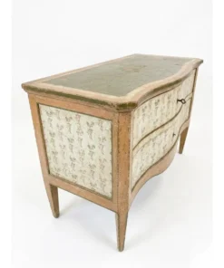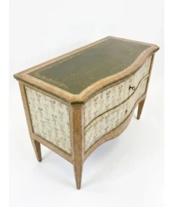 This exquisite vintage Italian commode captures the romantic elegance of 18th-century Venetian design. Hand-painted with meticulous detail, the chest features a graceful serpentine front and sides, standing on elegant tapered legs that lend a light, airy silhouette to the substantial piece. The commode is finished in a sophisticated palette of earthy tones, featuring a sage green top accented with delicate gilt-stenciled borders. The drawer fronts and side panels are adorned with charming hand-painted floral sprigs against a cream-colored ground, framed by soft terracotta and ochre trim. This artisanal approach ensures that no two pieces are exactly alike, highlighting its authentic Italian heritage. Equipped with two deep, spacious drawers, this commode offers significant storage while maintaining a refined profile. The subtly curved “bombe” influence is paired with original-style hardware, including a classic skeleton key that serves as a functional pull. The distressed patina throughout the painted finish adds a layer of “shabby chic” character and historical depth, making it a perfect statement piece for a bedroom, foyer, or living room.