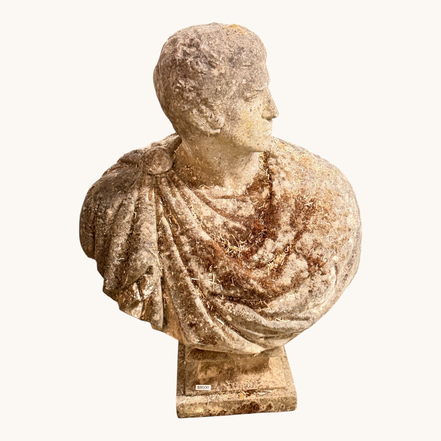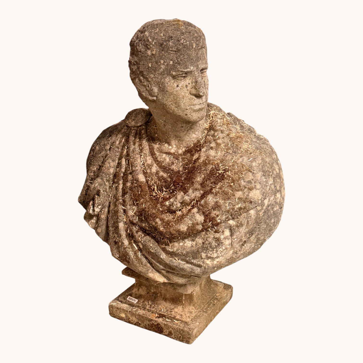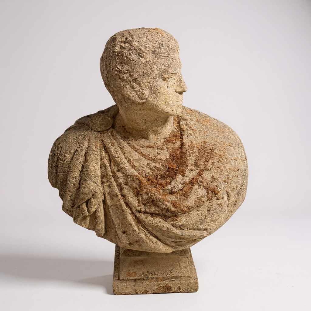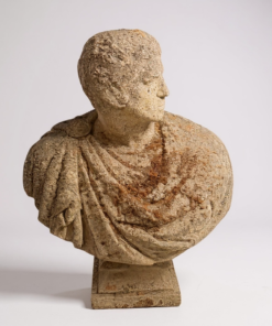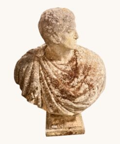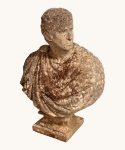 The handsome figure is shown wearing traditional Roman attire, with a toga gracefully draped across the chest and a sculpted cartiglio resting on the shoulder. The bust’s commanding scale and refined carving make it an outstanding focal point for a garden, terrace, entry hall, or formal interior.