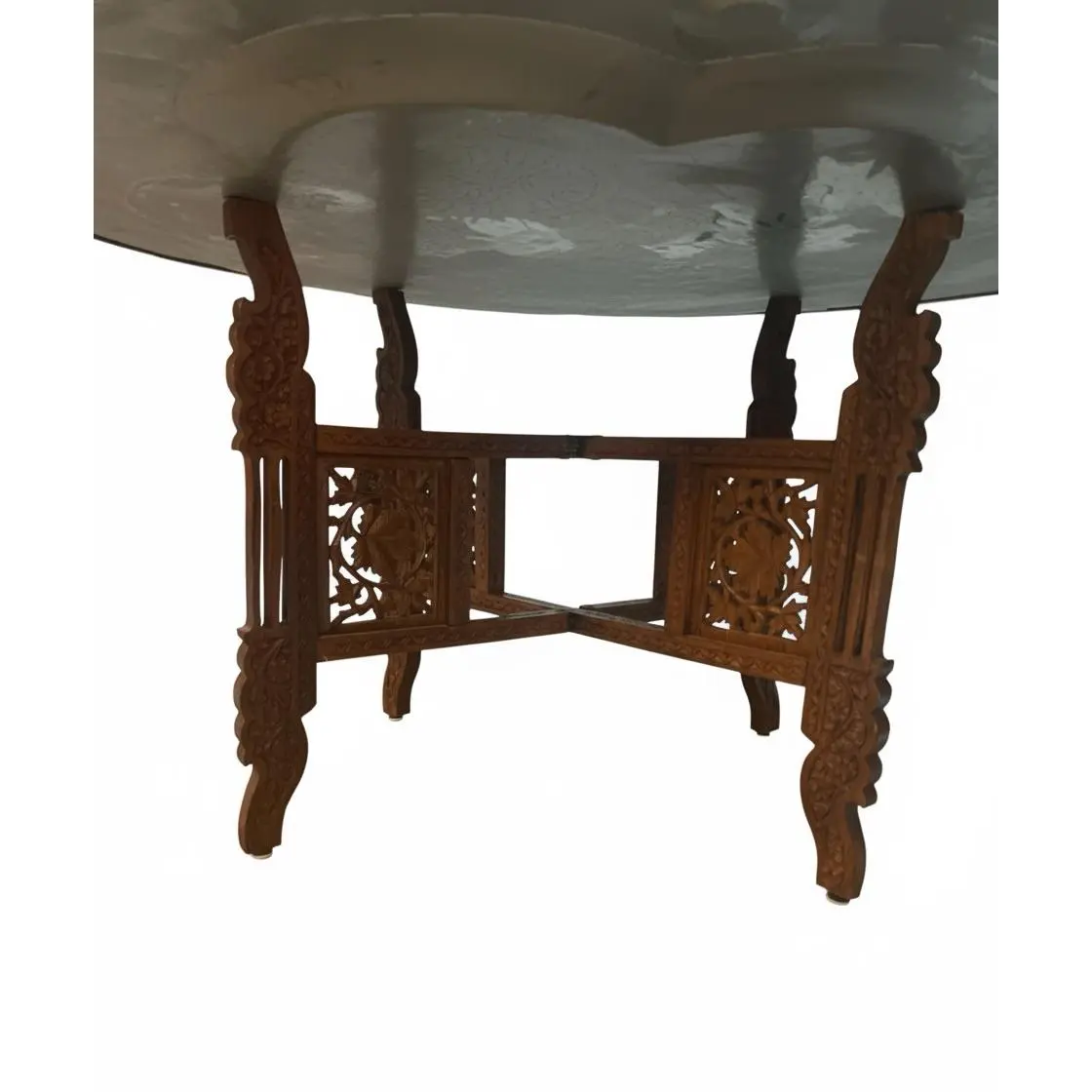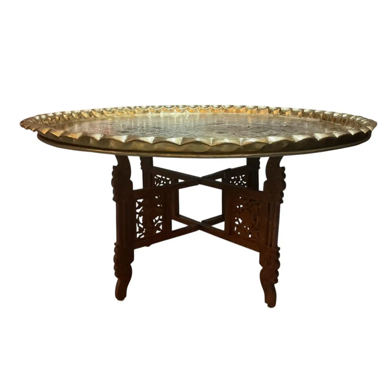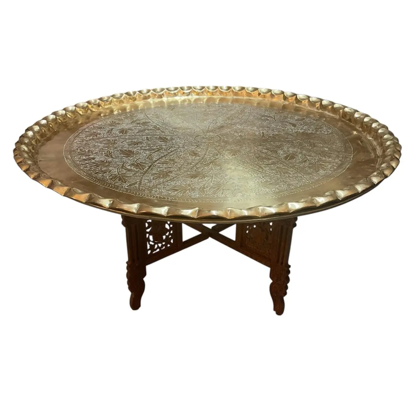 A stunning piece of vintage Moroccan craftsmanship, this tray table embodies traditional Moorish design and elegance. The round brass tray top features intricate, hand-etched or hand-hammered foliate and geometric designs, typical of Moroccan metalwork, with a classic, deeply scalloped “pie crust” rim. The brass has developed a beautiful, warm patina over time, consistent with its vintage age.