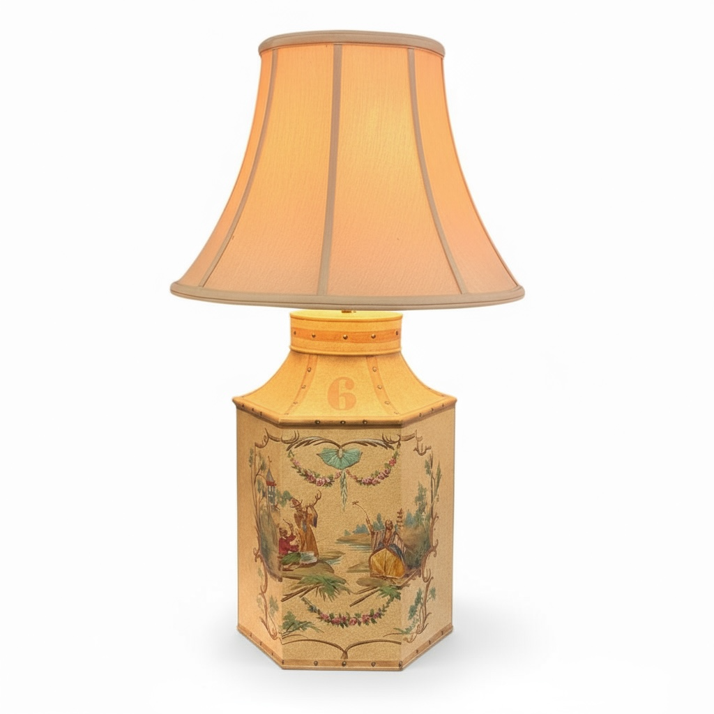 Beautiful vintage yellow lacquer hexagonal Tea Caddy lamp, hand-painted with delicate Chinoiserie motifs. Each panel features floral arrangements displayed in vases, baskets, and small scenic landscape elements, all framed with decorative detailing. The number painted on the caddy traditionally identified the type of tea once stored inside, while the Chinese character for tea “茶” appears on the back.