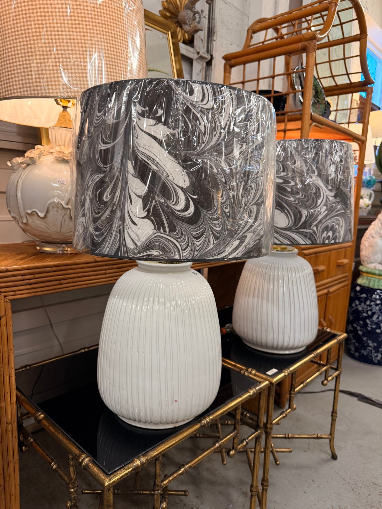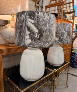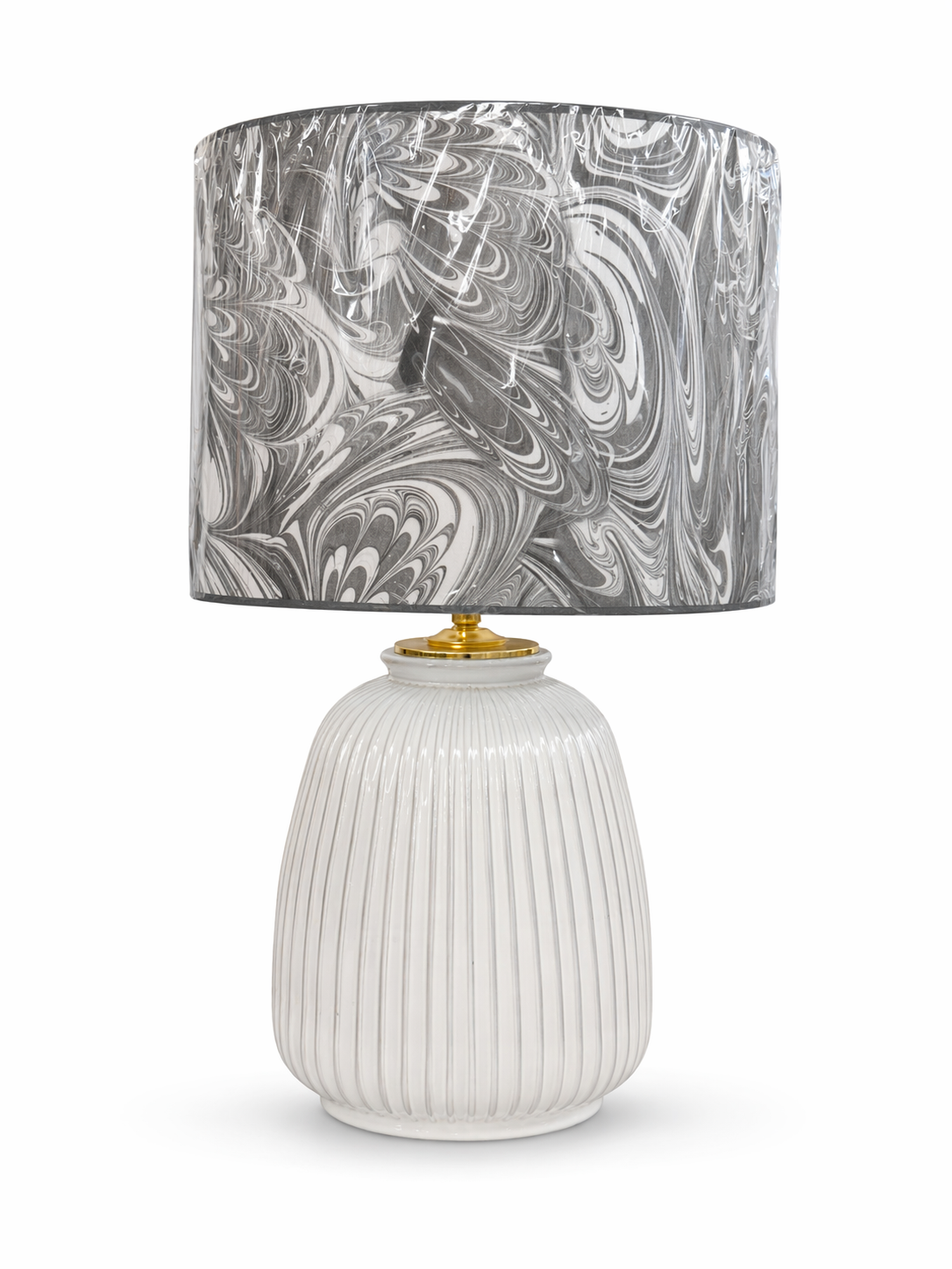 Elegant white ceramic lamp with a ribbed texture, paired with a bold marbled shade. A refined, modern piece that adds contrast and sophistication to any interior.
