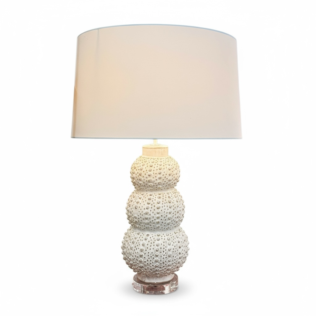 Chic coastal-inspired white sea urchin table lamp featuring a triple–stacked textured base on a clear acrylic foot. Wired for electricity and sold with shade included. A stylish accent for coastal, modern, or Palm Beach interiors.