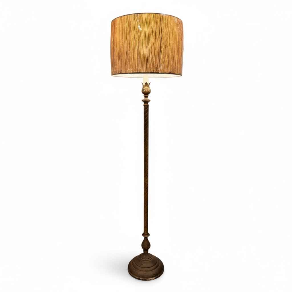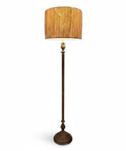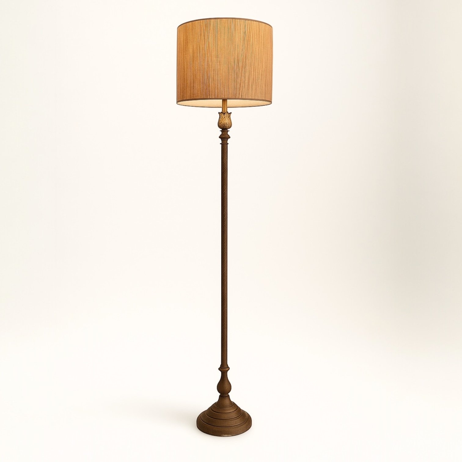 Elegant and understated, this floor lamp is crafted from solid wood and expertly finished in a rich, bronze-painted coating that mimics the look of aged metal. The tall, turned silhouette rests on a tiered round base, bringing classical balance to the design. Topped with a pleated golden fabric drum shade, it casts a warm, ambient glow perfect for cozy corners or refined reading spaces.