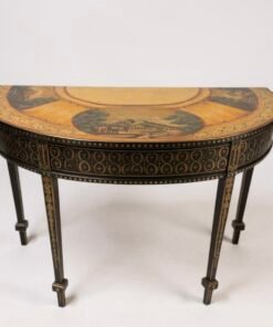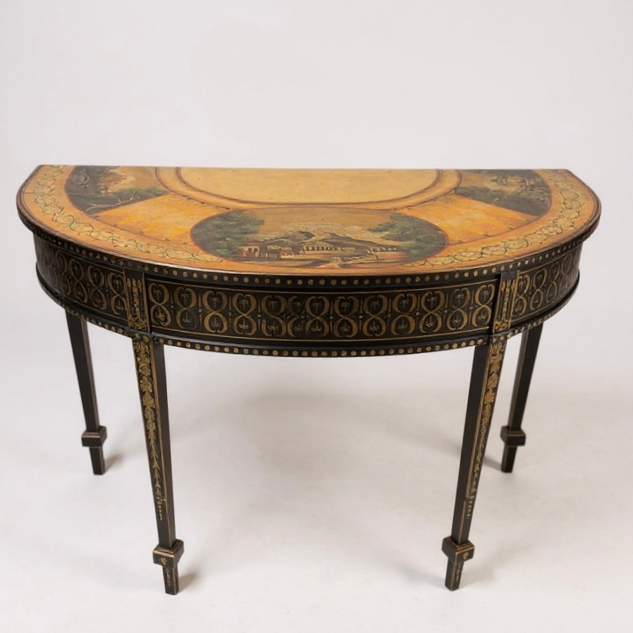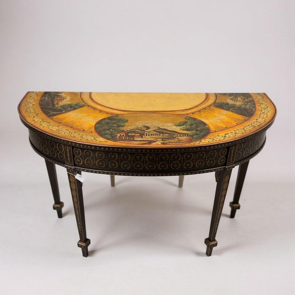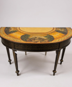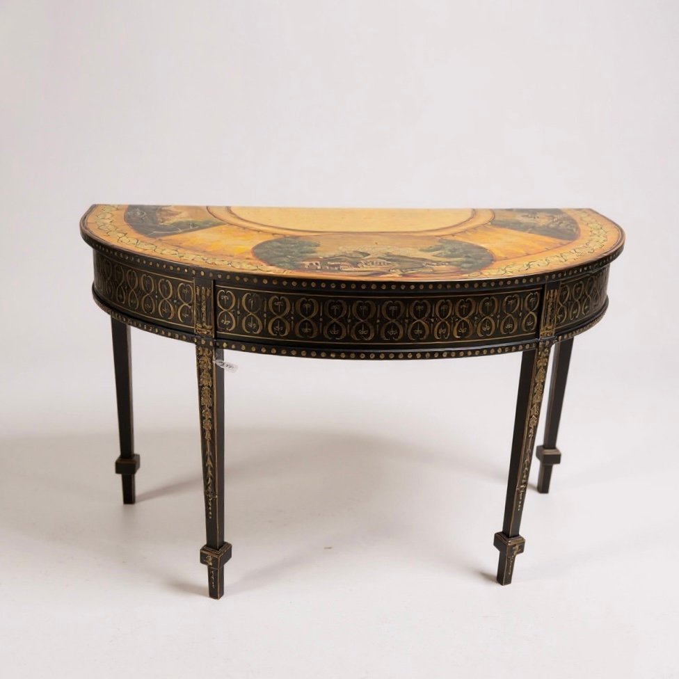 Elegant hand-painted wooden demi-lune console table featuring a richly decorated top with classical landscape scenes and warm golden tones. The shaped half-moon surface is framed by decorative borders, while the apron and slender legs are finely detailed with painted motifs and subtle gilded accents. Raised on tapered legs, this console blends Old World artistry with refined craftsmanship, making it a striking accent for an entryway, hallway, or behind a sofa. A timeless decorative piece that brings character and European charm to any interior.